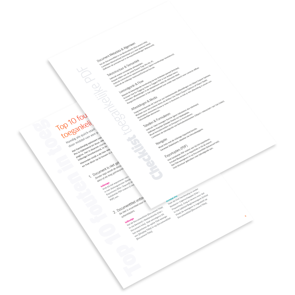 Wil je zeker zijn dat jouw PDF’s voldoen aan de richtlijnen voor toegankelijk design en de European Accessibility Act (EAA)? Download dan onze praktische checklist en uitgebreide gids voor toegankelijk PDF-ontwerp en ga meteen aan de slag.